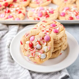 These cookies are a spin on our classic M&M cookies but filled with red, white and pink M&Ms. The cookies are so delicious and simple but are great for sharing, Valentine’s parties and more.