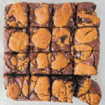 To make the brownies, in a large bowl, whisk the butter and sugar. Add the eggs and vanilla, and mix until smooth. Add the flour, cocoa powder, baking soda, and salt, and mix until just combined. Fold in the chocolate chips.