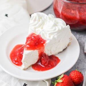 This quick and easy no bake cheesecake is ideal for summer and can be topped with fresh strawberries or your favorite toppings!