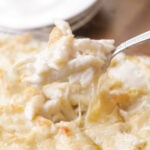 Add cream, ½ cup shredded Parmesan, and ½ cup Swiss cheese. Stir until cheese is melted.