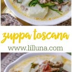Zuppa Toscana soup is most famous being served at Olive Garden, but has become a popular recipe over the years. In fact, Zuppa Toscana means a soup recipe from Tuscany, but it’s most commonly made from kale, zucchini, cannellini beans, potatoes, celery, carrots, onion, tomato pulp, extra virgin olive oil, salt, powdered chili, toasted Tuscan bread, and rigatino (Italian bacon).